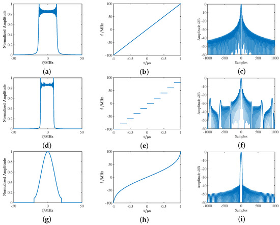 - Yue, W.; Zhang, Y. A novel nonlinear frequency modulation waveform design aimed at side-lobe reduction. In Proceedings of the 2014 IEEE International Conference on Signal Processing, Communications and Computing (ICSPCC), Guilin, China, 5–8 August 2014; pp. 613–618. [Google Scholar]