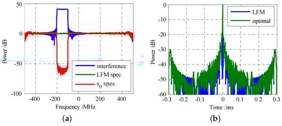 where is the inverse of the covariance matrix of the signal-independent interference. Subsequently, an efficient algorithm framework employing feasible point pursuit and successive convex approximation was proposed, demonstrating superior spectral compatibility compared to benchmark algorithms. By maximizing the SINR, the authors [50] considered synthesizing the transmit waveform based on the interference covariance, as shown in Figure 6. Experimental results demonstrated that pulse-compressed output is much better behaved and retains most of the range sidelobe characteristic of the LFM waveform.