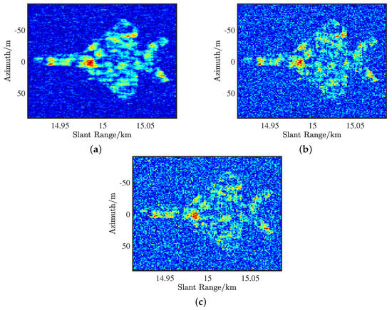 SAR images with different waveforms: (a) the weighted LFM signal, (b) the classical LFM signal, and (c) the classical P4 sequence.