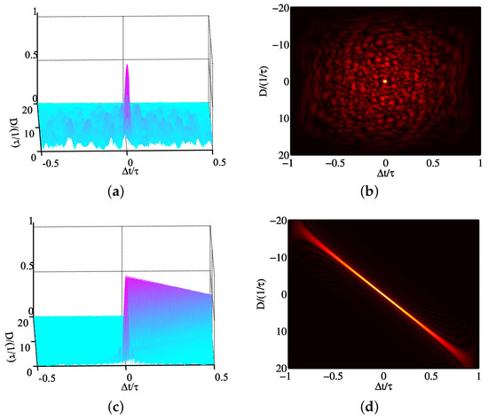 Partial 3-D and 2-D AF of the proposed waveform and LFMW: (a) 3-D AF of the designed waveform, (b) 2-D AF of the designed waveform, (c) 3-D AF of LFMW, and (d) 2-D AF of LFMW. , D, and represent time delay, Doppler frequency shift, and duration, respectively.