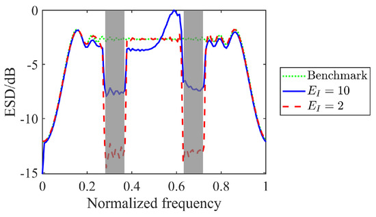 More generally, several methods have been proposed to shape the AF in terms of the PSLR or ISLR as metrics, which are also important indexes to evaluate the sidelobe suppression performance in radar waveform design [65]. To reduce PSLR, many efforts have been made in recent years [66,67,68,69,70]. A PSLR minimization problem under the spectral constraint was proposed in [66], providing a waveform design method based on alternating minimization with more flexibility in spectral adjustment. In [67], a minimum weighted peak sidelobe level design problem for waveform synthesis was constructed, subject to the spectral and PAPR constraints. Still pursuing the lower PSLR, an iterative majorizer algorithm was proposed in [68] to optimize waveform and mismatched filter.