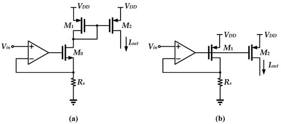 A traditional voltage-to-current circuit is implemented by OTA, as shown in Figure 1. In this conventional structure, OTA always drives a MOSFET and the resistor in a negative feedback loop [13]. Negative feedback can make the negative input of the OTA match closely to the output voltage, achieving an output current approximately equal to Vin/RS. In this topology, the driving transistor is either an NMOS or a PMOS. As shown in Figure 1a, the NMOS is used as the driving transistor, and the output current is copied through the PMOS current mirror. The minimum supply voltage is about Vin,max + VDS0 + VSG1. Instead, the supply voltage can be further reduced to Vin,max + VSD1 if the PMOS is used as the driver transistor, as shown in Figure 1b.