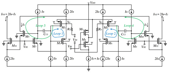 Another reported circuit [14] consists of a differential pair with two nested feedback loops, as depicted in Figure 3. The two main loops (loop 1 and loop 2) consist of M1 and M2 and M5 and M6, used for reducing the input impedance through negative feedback. M3, M4 and the current source I1 comprise a flipped voltage follower, which is used to reduce the source impedance of M4, M1, and M2 such that the voltages of node X1 and node X2 are close to VB1. This meets the condition of passing equal current. The third loop, which consists of M5, M7, and M9, and the fourth loop, which consists of M6, M8, and M10, are the high-gain negative feedback loops. They further reduce the impedance of nodes X1 and X2 whilst transferring the input current to the output without replication. Besides this, the high-gain feedback loop helps reduce the mismatch between each pair of transistors. Overall, the circuit achieves a high degree of linearity for voltage-to-current conversion. However, this circuit still relies on high supply voltage.
