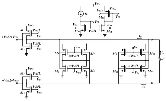 To allow very low-voltage operation, a bulk-driven CMOS inverter-based tunable transconductor has been proposed [15]. As depicted in Figure 4, M5–M12 form a positive feedback loop, which aims to provide a relatively large DC gain. All transistors operating in the subthreshold region permit the circuit to operate at a voltage as low as 0.25 V. Through the subthreshold current equation and the threshold voltage equation [15], the output current is derived as
