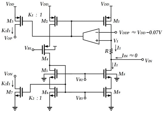 In order to avoid the undesirable effects of bulk driving, another reported work [17] focused on gate driving as shown in Figure 5. Due to the larger transconductance of the device, this circuit shows better noise performance when compared to that of bulk-driven transistors. It also optimizes the swing range of the output voltage. The circuit also generates sinking and sourcing currents and exhibits a large input common-mode voltage range. However, the current I1 = (VDDP − VIN)/R may be subject to the offset arising from the matching between the sourcing current and the sinking current. The input impedance of the circuit depends on the effective output impedance of the current mirror.