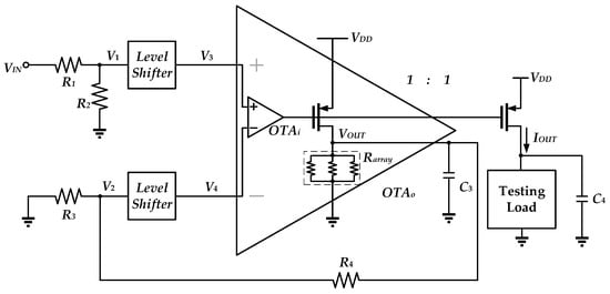 Figure 6 illustrates the topology of the proposed circuit. The circuit operates in the subthreshold region. This circuit consists of peripheral resistors, level shifters, and the OTAo. The resistors R1–R4 are formed by PMOS devices, which have small sizes and are known as pseudo-resistor (PR) devices [18]. These PR devices display very high impedance properties so that there is no loading effect on the input source and the output stage of OTAo. The function of the level shifter is to raise the input voltages V1 and V2 to higher voltages V3 and V4 in order to satisfy the input voltage range of the OTAo and to produce an intentional temperature coefficient in the circuit. The OTAo consists of an OTAi, which consists of two stages with active loads and a third stage formed by the PMOS driver transistor that drives the resistor array with the temperature compensation. The output current will be IOUT = VOUT/Rarray. With R1 = R2 = R3 = R4 = R, VOUT = VIN. By choosing R1 = R2 = R3 = R4, a symmetrical circuit structure can be procued, which offers a good common mode rejection ratio.