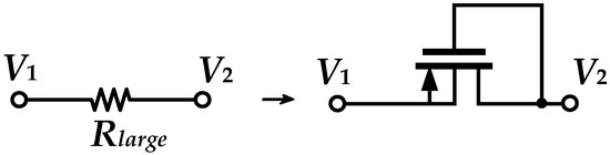 PR, which was introduced by Delbrück in 1984 [18], usually uses a PMOS transistor as a diode connection to operate in the cutoff region to provide an extremely large resistance. It is well-known and widely used for the acquisition of bioelectrical signals [19,20,21]. For the connection shown in Figure 7, if V1 is greater than V2, this structure is equivalent to a PMOS using a diode connection. If V1 is less than V2, the structure behaves like a bipolar transistor due to the positively biased PN junction formed by the drain of PMOS and the substrate. In this design, V1 is greater than V2, with V1 − V2 < |VTHP|, to allow PR to be in the cutoff region.