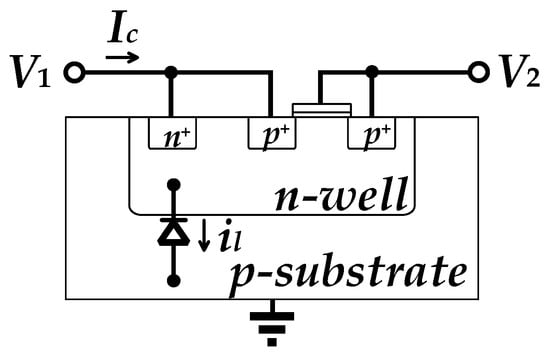 PR has an exponential I-V characteristic, and therefore poor linearity and a strong dependence on temperature and process. Another limitation of PR is the problem of current leakage due to parasitic effects. In diode-connected PRs, intrinsic leakage currents can exist in the diode formed between the p-substrate and the n-well of the PMOS transistor, thus affecting the output offset of the OTA [22]. As shown in Figure 8, Ic represents the current during normal conduction, whereas il represents the reverse leakage current of the parasitic diode. If V1 is connected to the high voltage terminal and V2 is connected to the low voltage terminal, an extra voltage drop is generated by il due to the leakage current in the reverse-biased diode. This phenomenon causes the mismatch at the two input ports of the OTA, leading to an output DC voltage offset. This problem will be further pronounced if the circuit features high gain. In order to suppress such a DC offset, the symmetric topology, depicted in Figure 6, is utilized to match the resistances in the positive and negative branches of the OTA. As such, the leakage current is treated as the common-mode signal and is rejected by the converter in a form amplifier topology.