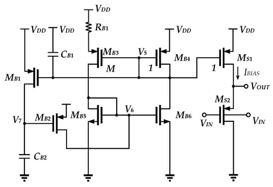 When the power is on, V5 rises to VDD, forcing MB1 to turn on and causing the ac shorting V7 to GND, thus making MB2 on. As a result, V6 is pulled high, which in turn causes the bias circuit to generate the bias current. V7 is then pulled high due to MB1’s operation, which causes MB2 to be turned off. V5 is pulled low after the bias current has been established. Then, MB1 is turned off. When the capacitive-based startup circuit has completed its action, it is isolated and no longer contributes any additional current, hence reducing power consumption.