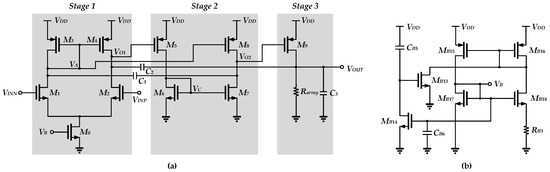 Due to the low supply voltage, the OTA can only operate in the subthreshold region, and the VDS needs to be greater than 100 mV in order to allow the MOSFETs to operate in a valid region. Besides this, the use of a cascode structure to increase the DC gain is not permitted under ultra-low-voltage design. Although the two-stage topology on the basis of a single Miller compensation capacitor is simple and efficient in terms of size, the overall DC gain may be not sufficient to meet precision requirements due to the intrinsic low output impedance of CMOS devices in the 40 nm technology node. Therefore, in order to obtain an OTA with a large gain whilst operating in the subthreshold region, this OTA design is based on the modification of the amplifier structure [23], as shown in Figure 10a. The main difference is that of the passive temperature compensation resistor array replacing the active load in this design of the final output stage.