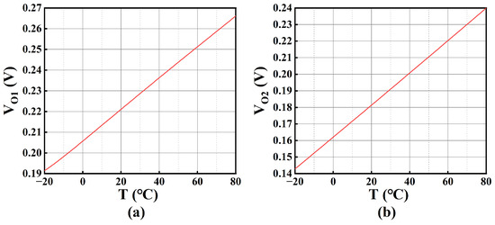 where ɑn (n = 1, 2, 3…) is the lumped constant. With MATLAB (version: R2023a) verification, VA can be considered as PTAT voltage. Due to the symmetrical structure of the first stage of OTAo, VO1 is equal to VA, which implies VO1 is also a PTAT voltage. Figure 13a shows the plot of VO1 against temperature.