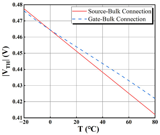 where the characteristic current in weak inversion IS = μp(T)CoxVT2, VTHP0 is the threshold voltage at T0 = 300 K, μp(T0) is the carrier mobility at T0 = 300 K, Cox is the capacitance of the gate oxide, W is the channel width, L is the channel length, VT = kT/q is the thermal voltage, k is Boltzmann’s constant, q is the electronic charge, and the subthreshold slope n is a constant between 1 and 3 [25,26]. n can be estimated to be 1.3 using this technology, which is convenient for theoretical calculation. mp is approximately 1.16, which is the exponential coefficient of μp(T) with respect to temperature, and κP is approximately 0.614 mV/K, which is the magnitude of the slope of VTHP(T). mp and κP are obtained from PMOS device simulation. Since VSD > 3 VT, this means that the exp[−VSD(T)/VT] term is small enough to be ignored, while λ is the channel length modulation factor. According to (14), the voltage VA in the first stage of OTAo (Figure 10) is