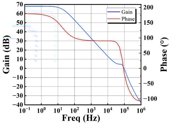 For the closed-loop configuration with the capacitive load capacitor C3 = 10 pF, the closed-loop gain (Figure 16) is −5.92 mdB, whereas the closed-loop bandwidth is 34.45 kHz. This indicates that the gain of the entire closed-loop system is about 1, achieving an output voltage equal to the input voltage.