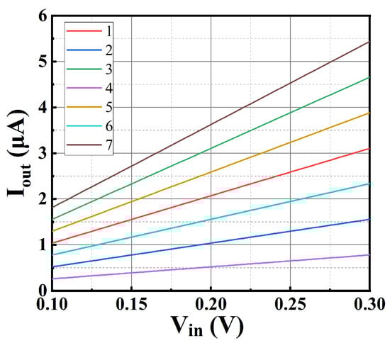 The input DC voltage of the design is in the range of 0.1–0.3 V, and the programmable binary-weighted output currents at T = 300 K, VDD = 0.45 V and the TT process corner are shown in Figure 17. The minimum output current is 260 nA, and the maximum output current is 5.44 μA.
