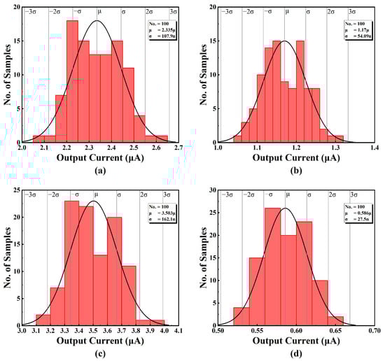 The results are summarized in Table 3, showing the mean and the standard deviation of seven different output current levels, as well as the sensitivity of the respective output currents. It has been confirmed that the variation is around a few percentage points, which is acceptable in the context of process variation. Due to the programmable feature in this design, the variation can be compensated for by tuning in applications that require higher precision.