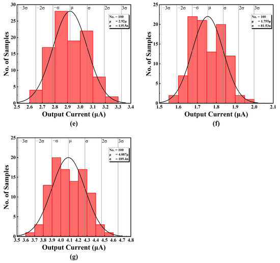 Monte-Carlo simulation result of (a) output current 1, (b) output current 2, (c) output current 3, (d) output current 4, (e) output current 5, (f) output current 6, and (g) output current 7.
