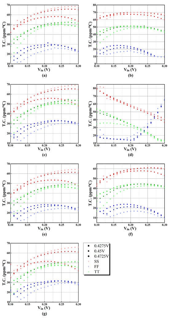 In order to observe the change in T.C. under process mismatch and variations in statistical approach, seven sets of Monte-Carlo simulations, with each comprising 100 random sample points, are illustrated in Figure 20. These Monte-Carlo simulations are performed at VDD = 0.45 V, and the input DC voltage VIN = VDD/2 = 0.225 V.