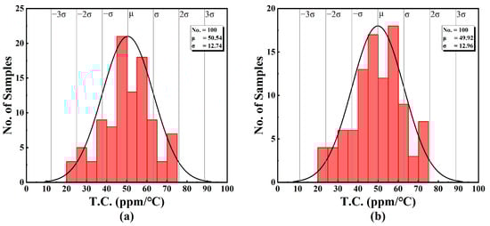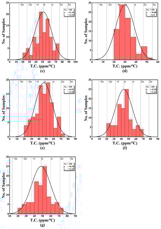 The results show that the mean value of the temperature constant is less than 52 ppm/°C, with a standard deviation of less than 13 ppm/°C. The obtained statistical performance parameters are listed in Table 5.