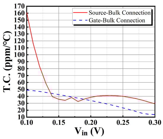For the benefits of using gate-bulk connections in level shifters, a comparison of the temperature coefficients of the output currents using gate-bulk connection and source-bulk connection is carried out at a supply voltage of 0.45 V and the TT process corner. This comparison is shown in Figure 21. The use of gate-bulk connection exhibits smaller and more stable temperature coefficients. Thus, the use of gate-bulk connections in level shifters helps optimize the temperature coefficient of the output current.