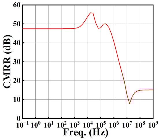 The CMRR of this circuit is shown in Figure 23. From Figure 23, we see that the CMRR at low frequency is 47.44 dB.