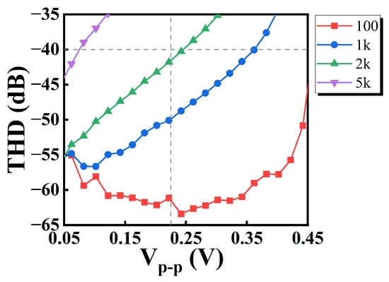 With THD = 1%, i.e., −40 dB as an upper limit, the input peak-to-peak value Vpp can reach a maximum of 0.36 V when the input frequency is 1 kHz. When Vpp is 0.225 V, the maximum input frequency can reach 2 kHz.
