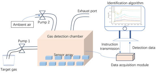 As shown in Figure 1, the E-nose system designed in this paper consists of three parts, the gas delivery module, the data acquisition module, and the identification algorithm. The gas delivery module transports target gases to the detection chamber (volume 1.88 L) via the pump 1, and clean ambient air is used to purge the detection chamber with the help of the pump 2. The data acquisition module is responsible for collecting the gas information sensed by the gas sensors. The identification algorithm completes the gas feature extraction and the classification and identification.
