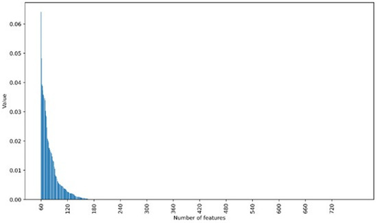 In order to explore the importance of the extracted features to the classification and recognition, the Boruta algorithm was used to analyze the original feature dataset. As can be seen from Figure 7, only 30 of the 720 features have a weight value higher than 0.01. These features with high weights play a key role in the classification and recognition. Therefore, the selection of features through an appropriate algorithm by retaining the features with higher weights and eliminating the features with smaller weights will help to simplify the recognition model. Interestingly, of these top 30 features, 16 are curve slope and interval difference features. These two types of features express the dynamic change process of the response curve, which indicates that the transient change of the response curve is the key factor for the identification of gases.