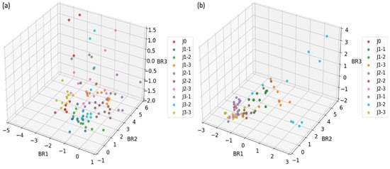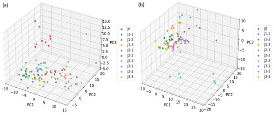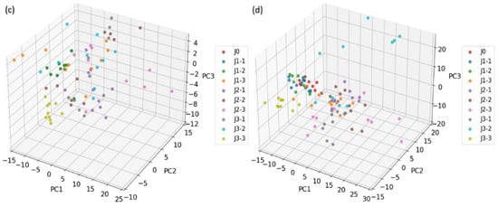 Figure 9 shows the distribution of different categories after the dimensionality reduction using as proposed Boruta-RFE algorithm. Compared with the PCA method, although there is still overlap between different categories, the sample distribution of the same category is more compact, and the intra-category aggregation is significantly improved, which indicates that Boruta-RFE has advantages in reducing feature redundancy and selecting the key features from the original feature dataset. Furthermore, from the 3D scatter plot after the Boruta-RFE dimensionality reduction on the feature dataset, it can be intuitively observed that the difference of category classification between the detection under a single operating temperature and under the modulation operating temperature. At a single operating temperature, the Boruta-RFE has shown good classification efficacy, although several of samples (e.g., categories J1 and J2, J2 and J3) are still loosely distributed. As more gas information can be obtained under temperature modulation conditions, which increases the expressive ability of gas feature dataset. Therefore, this not only significantly improves the tightness of the sample distribution within the same category, but also strengthens the dispersion effect between different categories. Especially for those categories with small differences in composition (e.g., classes J1-2 and J1-3, J2-2 and J2-3), temperature modulation can be used to distinguish these categories more clearly.
