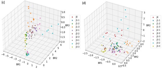 The purpose of the dimensionality reduction on the feature datasets is to reduce the computational complexity by simplifying the data structure while retaining the key information of the original dataset as much as possible. In order to compare the effectiveness of our proposed Boruta-RFE algorithm on the dimensionality reduction and the selection of gas feature datasets, we firstly use the traditional PCA method to analyze the original feature datasets. The results show that the first three principal components of PCA can explain 81% of the variance. As can be seen from the 3D scatter plots (see Figure 8) of the PCA analysis, there are obvious overlaps between the different categories of samples. This result is consistent with the findings of Haowu et al. [31,32], which suggested that while principal components can explain most of the variance of the feature dataset, they may still not be effective in distinguishing different sample categories.