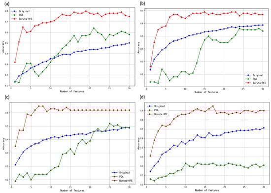 Figure 10 also shows the identification accuracy of the feature dataset based on the original feature dataset and the feature dataset analyzed by the Boruta-RFE algorithm (“Original” refers to the feature dataset that has not undergone any dimensionality reduction. Specifically, the process involves randomly selecting a subset of dimensions from the feature dataset, performing 30 independent modeling runs, and then averaging the results from all the models.). It can be seen that the Boruta-RFE algorithm shows the best results. This indicates that it has a good ability to extract key features from the original dataset. At a low number of features (less than 10 features), the identification accuracy based on the Boruta-RFE dataset increases rapidly and achieves the best accuracy with 10–15 features. With more addition features, the improvement in identification accuracy is not obvious. This confirms that the Boruta-RFE algorithm can extract the features that are most useful for identification task, without adding more redundant features that affect the E-nose performance.