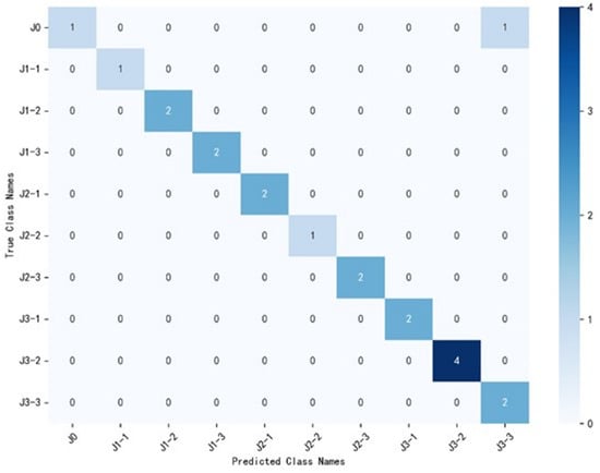 Based on the temperature modulation dataset, 17 features were ultimately selected to train the classification model, which obtained the identification accuracy of 95%. Figure 11 shows the confusion matrix of the identification process. The big numbers along the diagonal indicate that the model exhibits excellent identification performance. Notably, only one sample from the J3-3 category was misclassified as J0. This result demonstrates that temperature modulation could provide much more information that in turn enhance the discrimination between the categories with very subtle small differences.