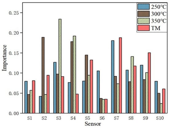 Figure 12 shows the sum of the feature importance of all the gas sensors in the four datasets (“Importance” refers to the sum of each sensor’s contribution to all the features.). It can be observed there is a significant difference in the response contribution between the sensors when they worked at different operating temperatures. Sensor S3 has the highest contribution (0.2339) at 350 °C, indicating that it has the best sensitivity under this temperature, S2 exhibits its peak contribution of 0.1889 at 300 °C, confirming that it performs more prominently in the medium temperature range, and S7 and S9 have higher contributions under temperature modulation (TM) conditions (0.1879 and 0.1504), respectively, showing that the modulation of the operating temperature could effectively arouse their response to target gases. In addition, the contribution of sensor S6 is relatively low at all temperatures. This result indicates that its response sensitivity to the gas of the current experimental samples is weaker than that of other sensors. In summary, each sensor has different sensitivities at different operating temperature and has its own optimal operating temperature range. Therefore, the sensors should be adapted according to their operating temperature characteristic so as to improve the performance of the E-nose system.