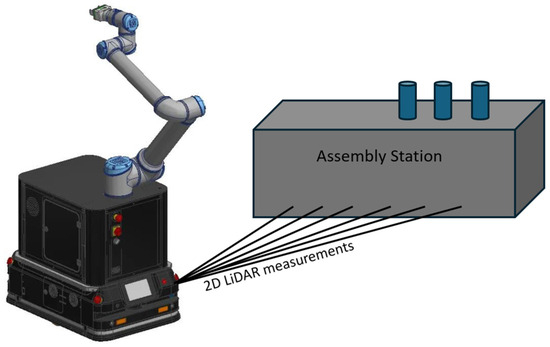 High-precision distance measurements [29] are particularly relevant in the context of ensuring accurate docking of the AGV to the AS, as well as at intermediate points where the AGV must halt to recalibrate its position. For instance, following the docking of the AGV to the AS, the CR mounted on the AGV (CoBotAGV) [30] will acquire information regarding the precise and accurate position of the AGV relative to the AS (Figure 1). This facilitates accuracy enhancement during the recalibration of the CR arm to its new mounting position on the AS. Furthermore, the CR can assess whether the docking location allows for the proper and safe performance of assembly tasks on the AS.