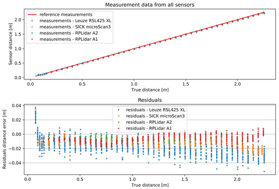 The tested 2D LiDAR sensors were configured using default settings and were not programmatically corrected in any manner to allow for a comparison of their characteristics. The results of the distance measurements of all the 2D LiDAR sensors are presented in Figure 3. In the upper part of the figure, the distance measurements for the uncalibrated sensors and the reference sensor are presented. In the lower part, the differences between the distance measurements of the uncalibrated sensors and the reference sensor are presented. As can be observed, the measurement error for each sensor is different for each measured distance. This affects the accuracy of the distance measurement at any distance from the target. The sensors must, therefore, be calibrated to achieve greater accuracy.