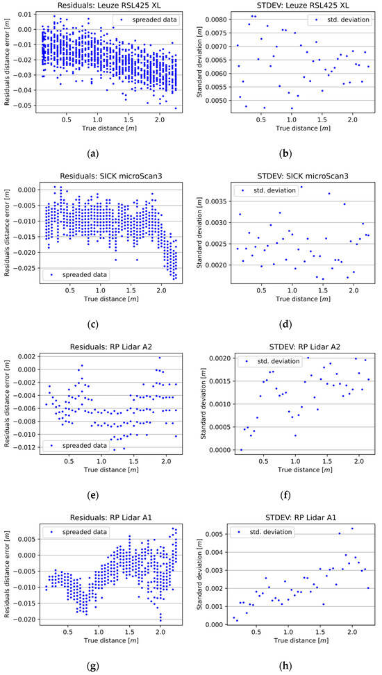 The measurement characteristics of selected 2D LiDAR sensors. The left column (a,c,e,g) presents the differences between the 2D LiDAR sensors’ measurements and the reference distance measurements. The right column (b,d,f,h) presents the standard deviation of a given sensor at a given distance.