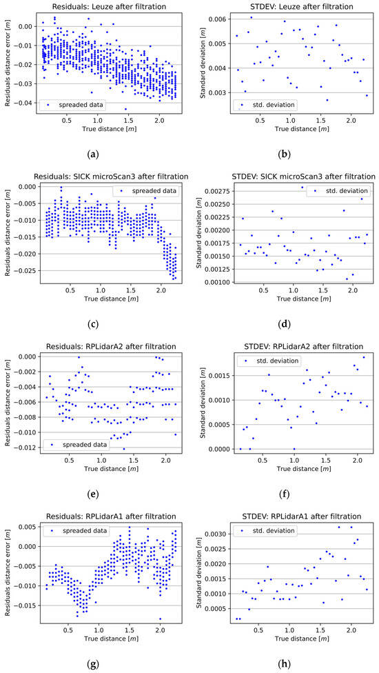 As Figure 4 shows, every 2D LiDAR sensor has its own measurement characteristics. Their common property is that they lack accuracy and precision. It is possible to calibrate them using a number of calibration methods, but this will only improve the accuracy of the given sensor. The precision of the measurements also influences the final accuracy of the given measurement system, and the filtration phase helps the curve fitting process, narrowing the spread of the measurements in the series. This is the reason for using the filtration phase prior to the calibration method.