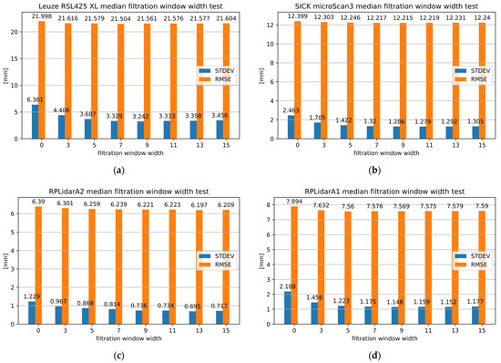 The aforementioned MSCwMF method was employed in the analysis of selected 2D LiDAR data for window widths ranging from 0 to optimal. The outcomes of the calibration methodology for the selected 2D LiDAR sensors are presented in Table 5. The initial RMSE and STDEV values of the raw data, prior to filtering and calibration, are presented for each 2D LiDAR sensor in a row for a window width of 0.