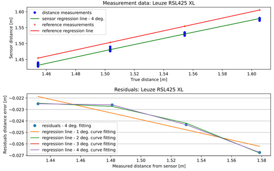 First, the MSCwMF method was applied to the RSL425 XL sensor. Figure 7 shows the results for different polynomial regression line degrees. At the top of the figure are the distance measurements gathered from the RSL425 XL sensor, together with the reference measurements and the regression line. There is also the result of curve fitting—the RSL425 XL’s polynomial regression line of a specific degree. At the bottom are the differences between the RSL425 XL and the reference regression lines. These points represent the correlation between the residual value and the distance measurement given by the RSL425 XL sensor. There are also polynomial regression lines of specific degrees fitted to the residuals. As can be observed, the accuracy of fitting increases with the degree of the fitted regression line. The higher the degree of regression line fitted to the measurements, the more characteristics of the sensor that can be fetched.