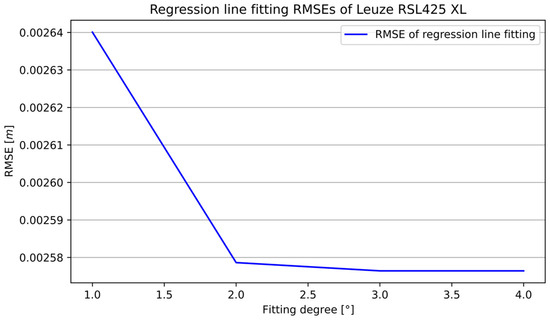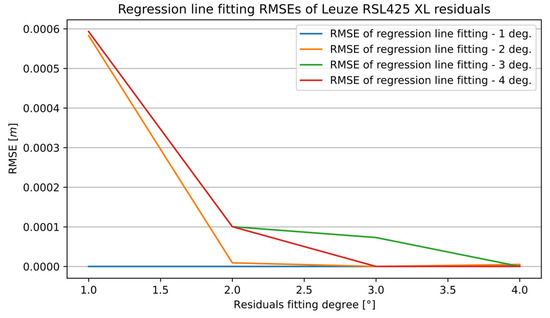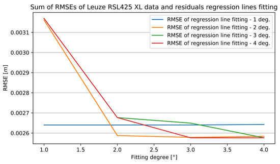 Figure 9 presents the RMSE of the curve fitting to the residuals with different degrees of the fitted polynomial regression line. Each line represents a specific degree of the curve fitting regression line to the distance measurements.