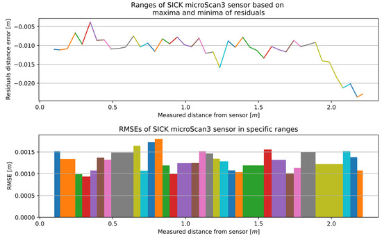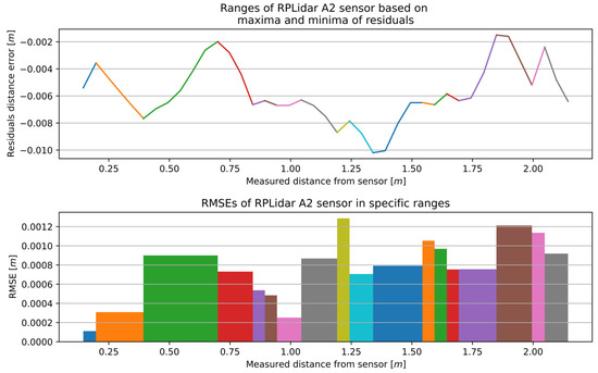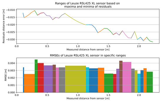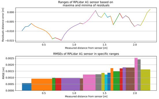 The aforementioned calibration method for the RSL425 XL was implemented on the microScan3, RPLidar A2, and RPLidar A1. The characteristics for the remaining 2D LiDAR sensors with optimal window width are presented in Figure 12, Figure 13 and Figure 14, while the number of sections and the range of RMSE values are presented in Table 4. The RMSE value of the best fitting was calculated for each section. The final RMSE value for the MSC was calculated based on the average RMSE values from all sections.