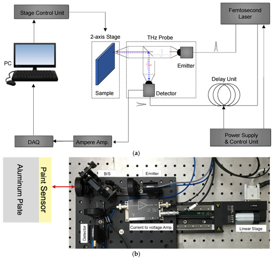 An experimental setup was designed to validate the proposed THz wave-based thickness measurement method against commercially used techniques (Figure 2). The THz-wave-based thickness measurement system (Figure 2a) employed a beam splitter to ensure that the THz waves emitted from the emitter were perpendicularly incident (θ = 0°) onto the sample. The detector then measured the THz waves reflected from the boundaries of the medium.