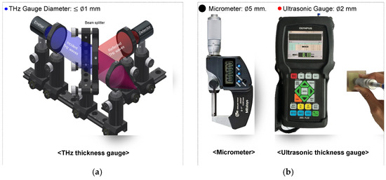Thickness measurement methods: (a) proposed THz-based gauge and (b) commercial micrometer and ultrasonic gauge.