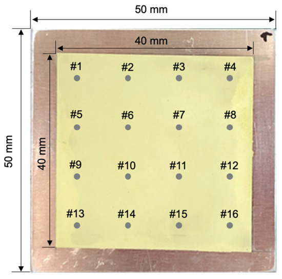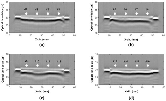 Locations from points #1 to #16 were selected for thickness measurement, considering the probe size of the thickness gauge with the largest measurement area. The progressive darkening observed from points #1 to #16 along the diagonal corresponds to the increasing distance between the THz detector and the specimen during the raster scan.