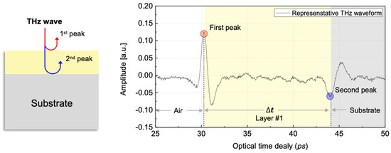 where represents the thickness of the sample, denotes the peak-to-peak time (Figure 4), c is the speed of light in air, corresponds to the refractive index of the sample, and represents the incident angle of the THz waves.