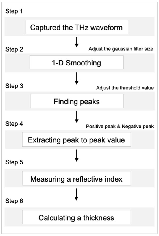 The full-field thickness visualization method proposed in a previous study [16] was employed in the time domain. Visualization in the time domain using a measured THz waveform is called THz pulse time-domain visualization (TTV). The visualization process (Figure 7) involved the following steps: