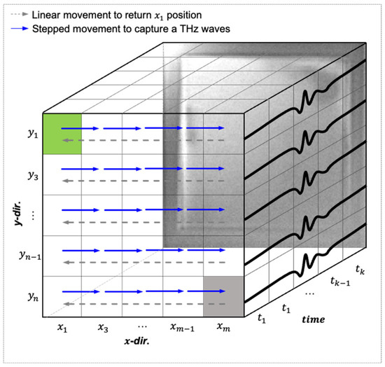 (2) The motorized stage affixed to the sample moved in the x direction during THz wave measurement. It moved in the y direction upon reaching the endpoint before returning to the start point and continuing with the measurement;