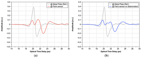 Figure 8a shows a representative THz wave in a normal area, whereas Figure 8b shows a representative THz wave in a delamination area. In well-adhered regions, reflection signals were observed only at the surface and the back surface (aluminum plate). Conversely, an additional reflection signal was detected at approximately 11 ps in the delaminated areas, corresponding to the air gap between the metal plate and the paint sensor (Figure 8b). This additional signal appeared alongside the reflections from the surface and back surface.