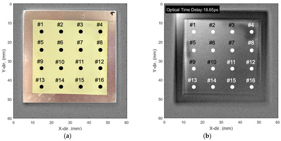 Smart paint sensor images: (a) optical image of the sensor with 16 sensing points and (b) full-field THz image showing the optical time delay distribution.