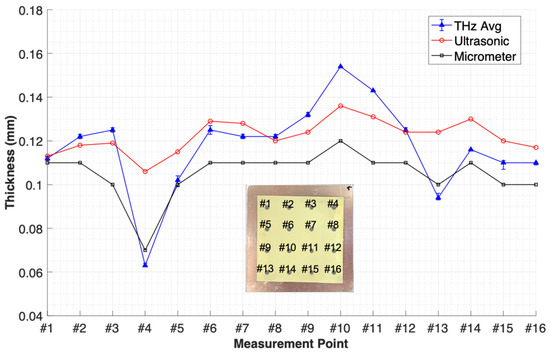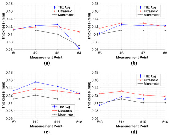 Table 1 summarizes the measurement results obtained using the proposed THz method. For comparison, the results from ultrasonic and micrometer measurements are also included. The error bars were determined based on the range between the maximum and minimum values for each measurement point. The analysis of these error bars confirms the reproducibility of the proposed method, as the variations in the measured values remained within a small range (±0.001–0.002). Additionally, at certain measurement points (e.g., points 10, 11, and 14), no variation was observed, indicating stable and consistent measurements.