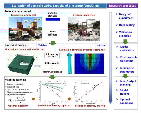 In order to solve the difficulty of carrying out compressive static load tests on existing bridges, this paper proposes a rapid prediction method for the dynamic-to-static stiffness contrast coefficient to evaluate the vertical bearing capacity of pile group foundation of a bridge. The developed method combines an in situ experiment, a three-dimensional numerical analysis of the platform–pile–soil interaction, and machine learning, offering a novel approach for pile foundation survey evaluation and design.
